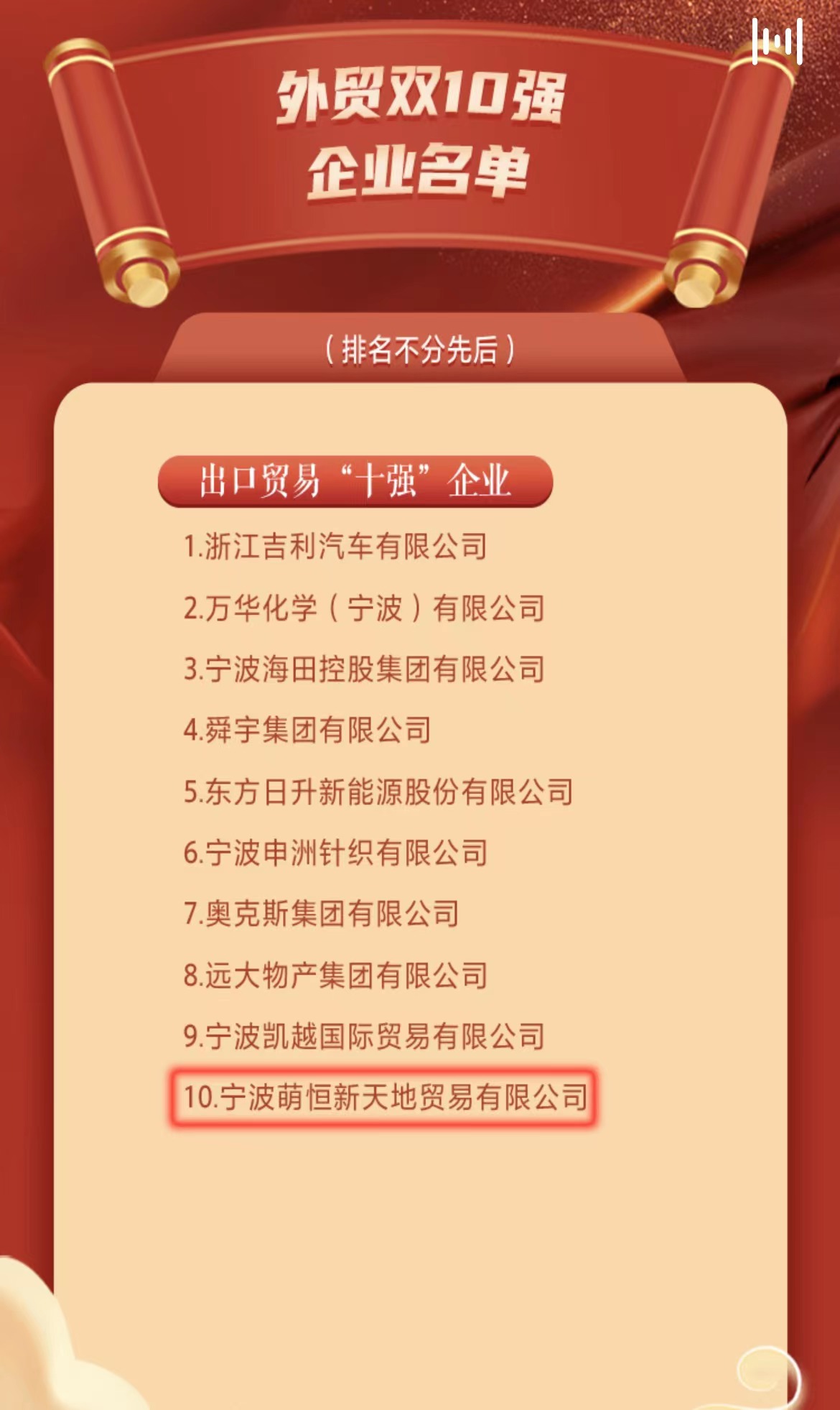 7月14日上午,被譽為“寧波經濟奧斯卡”的2022寧波創新創業風云榜再次揭開帷幕。寧波萌恒新天地貿易限公司憑借強大的綜合實力、長足的提升能力和不竭的發展動力榮獲開放提升類外貿雙10強企業中的出口貿易“十強”企業!
