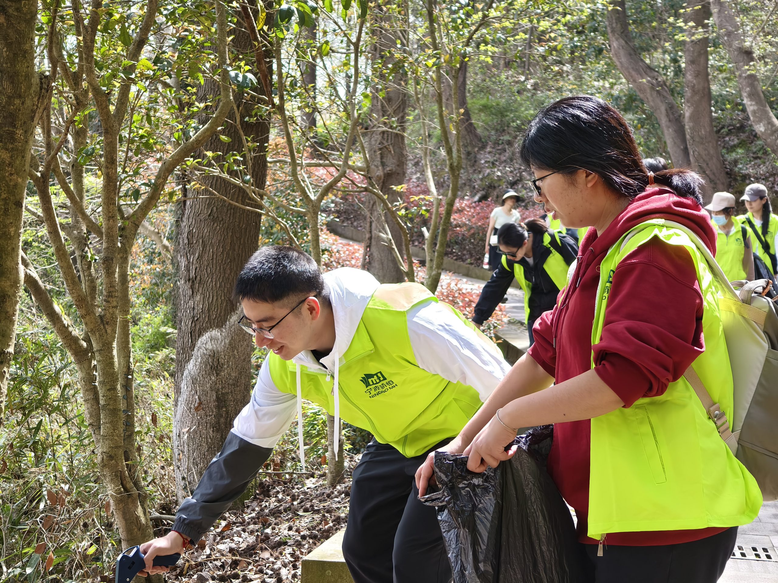 上午九點,所有小伙伴準時乘坐大巴前往海曙區鄞江鎮它山堰,開啟綠色徒步行。走進山林,陽光明媚,天朗氣清。身穿綠色背心的志愿者兩兩一組,分工明確,一個手拿垃圾鉗,一個手拿垃圾袋,仔細搜尋沿途的每一個角落,不落下任何一個垃圾,即使是隱藏在樹林草垛中的垃圾也被志愿者們“收入囊中”。一俯一仰間,他們共收獲了十余袋各色垃圾,經過的每一處,留下的只有青山碧水、綠樹紅花。