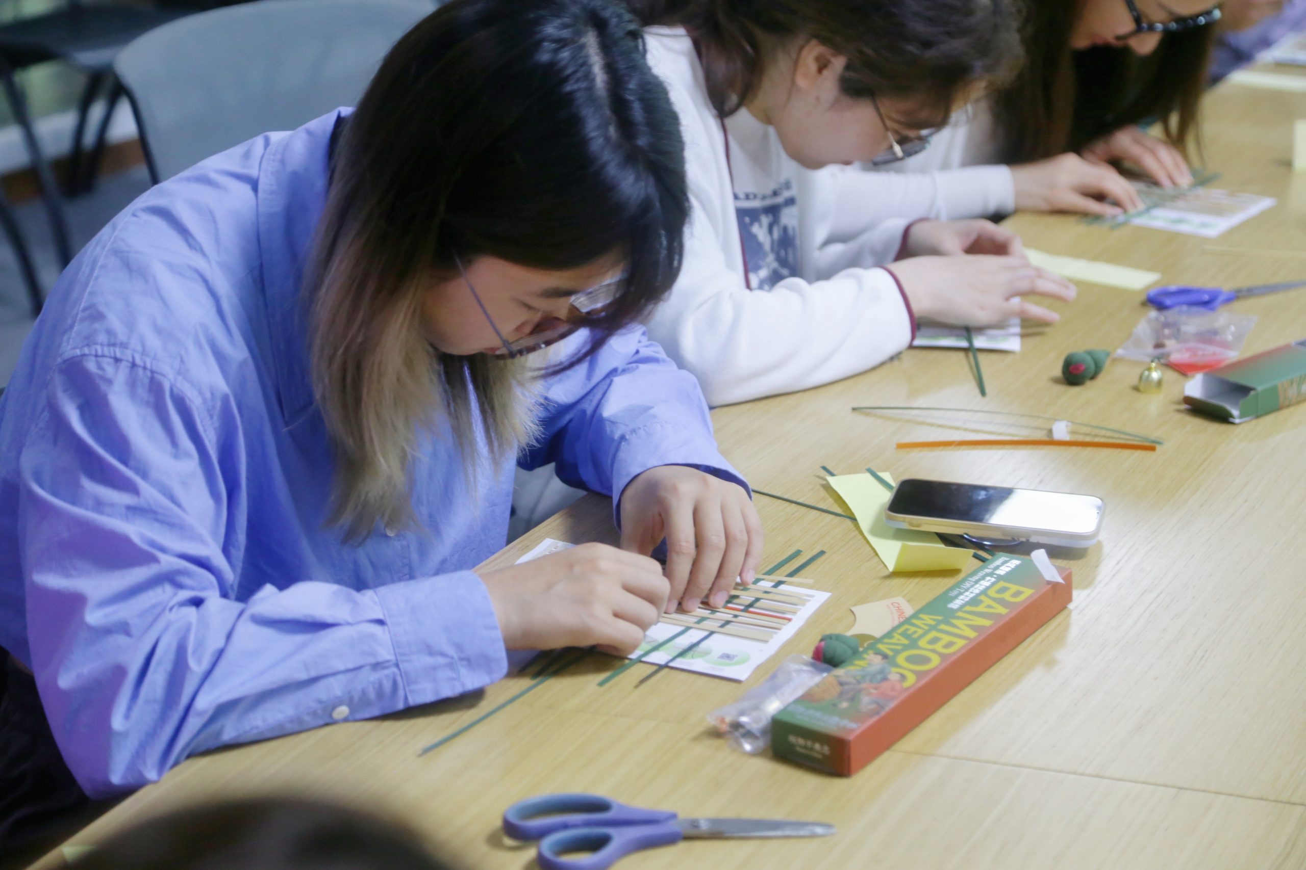 6月7日中午,當(dāng)小伙伴們來(lái)到活動(dòng)場(chǎng)地時(shí),材料制作包早已整整齊齊地?cái)[放在座位上。隨著全員有序落座,活動(dòng)正式開(kāi)始。在老師的耐心講解和視頻輔助下,大家專(zhuān)注而細(xì)致地開(kāi)始穿竹引線(xiàn),細(xì)長(zhǎng)的蔑片在每個(gè)人的指尖上交互翻動(dòng)。當(dāng)制作遇到瓶頸時(shí),有人向老師請(qǐng)教,有人和同伴探討,現(xiàn)場(chǎng)一片和樂(lè)的氛圍,超級(jí)有愛(ài)!