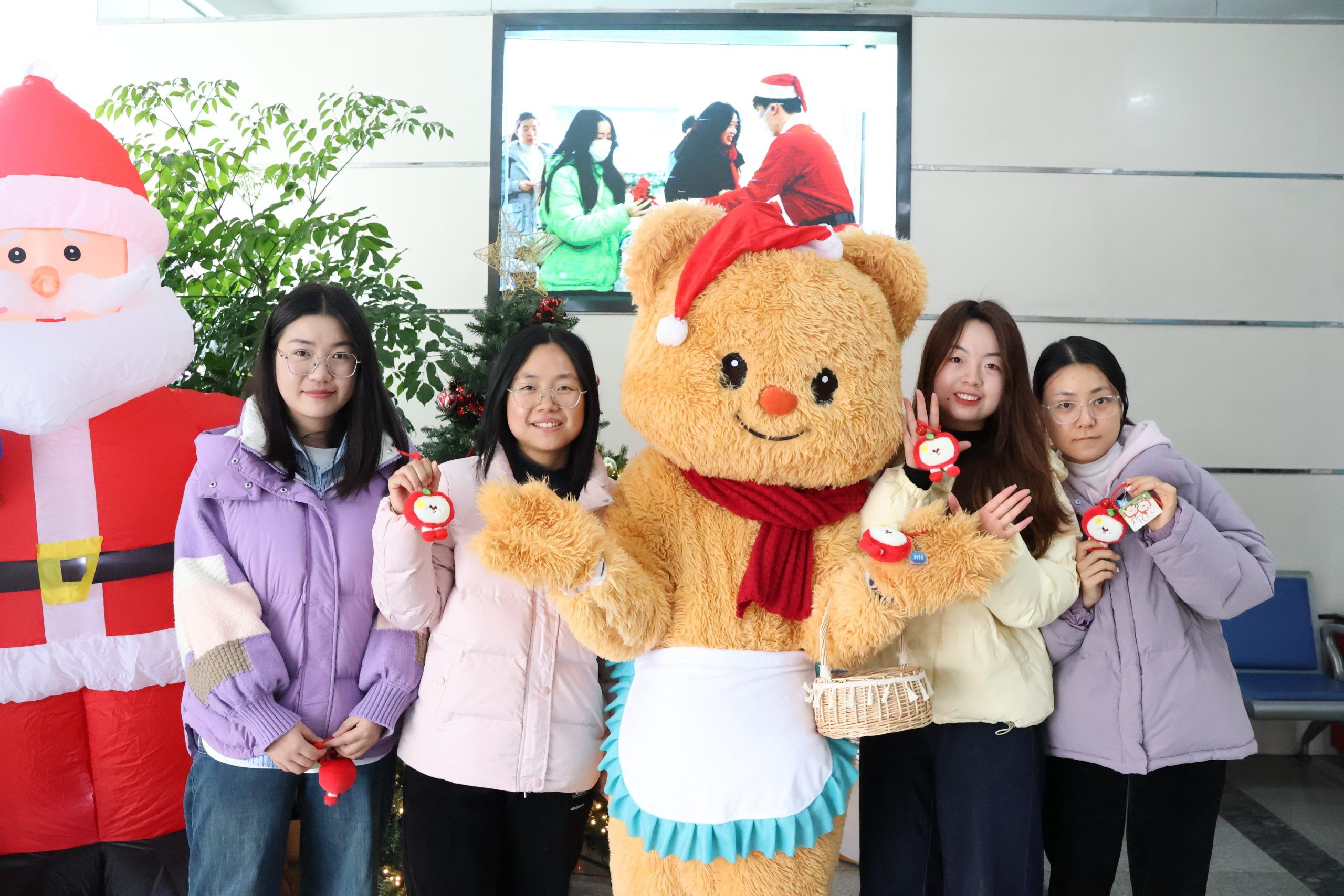 12月25日,國貿事業部的工作人員早早守候,化身圣誕老人,將一份份“蘋” 安果禮袋送到大家手中。紅蘋果在晨光下閃耀,糖果散發著甜蜜氣息,掃碼抽獎的小賀卡暗藏驚喜,為新的一天注入滿滿活力,開啟專屬于萌恒人的圣誕好運。中午時分,一樓大廳瞬間成為歡樂的海洋,萌態十足的黃油小熊,一出場就吸引了小伙伴們的目光。大家紛紛前來與小熊擁抱、互動、合影。它搞怪的動作、溫暖的 “熊抱”,?引來笑聲連連,傳遞別樣的活力與溫馨。